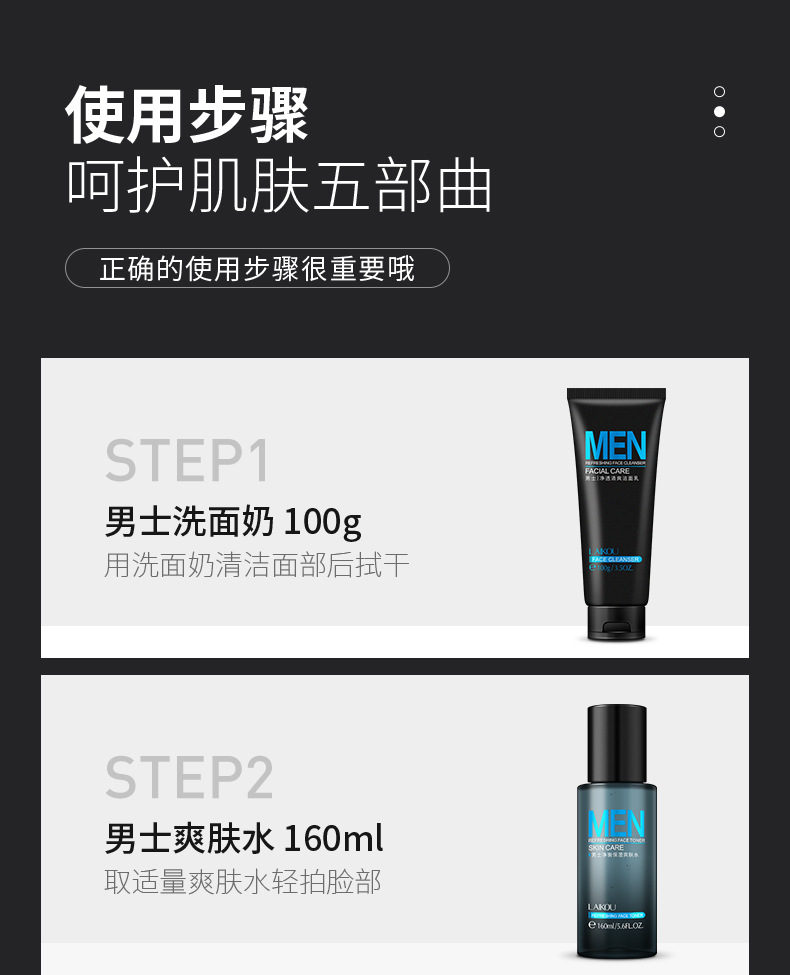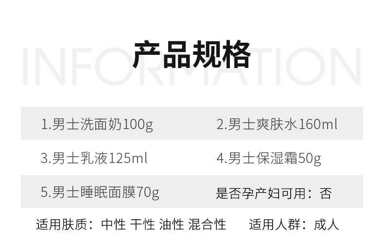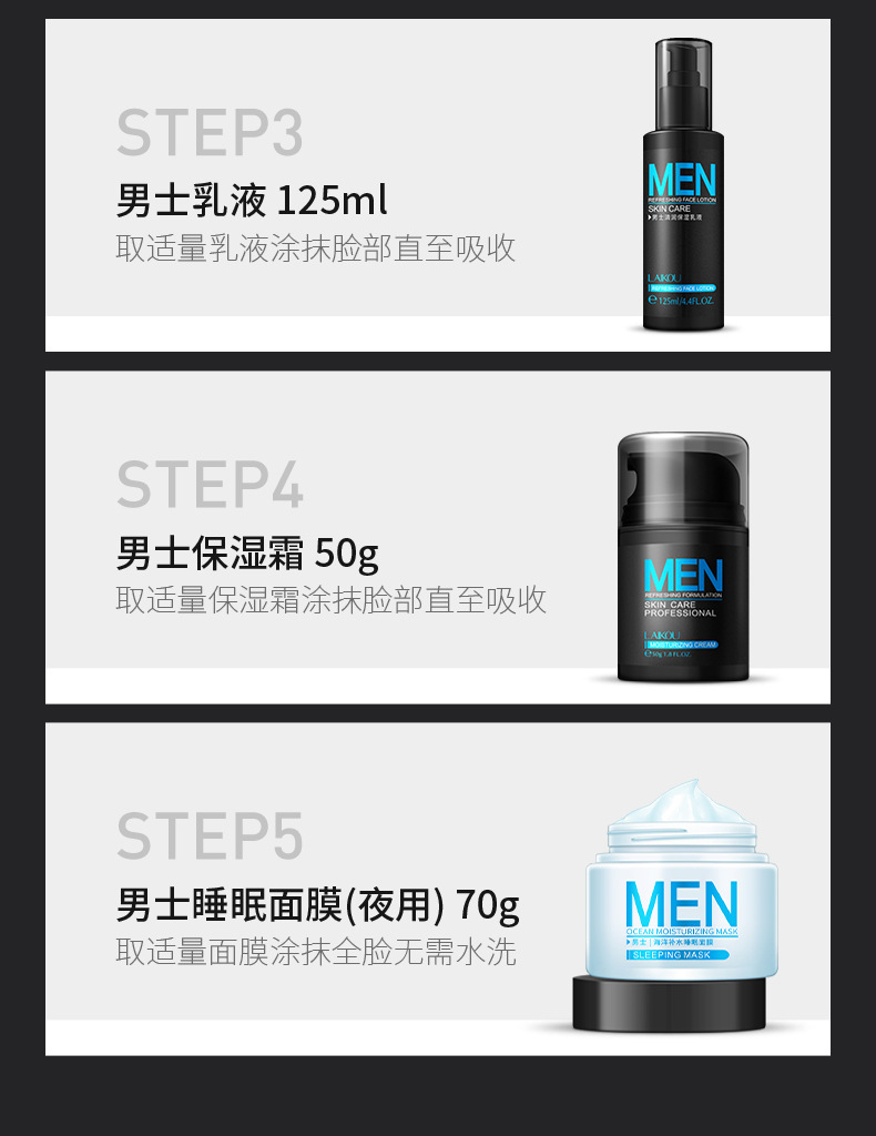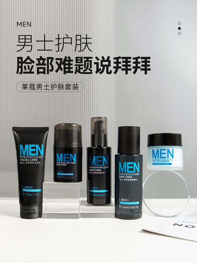 商品名称:莱蔻男士护肤套装补水保湿洗面奶爽肤水乳液面霜睡眠面膜一件代发