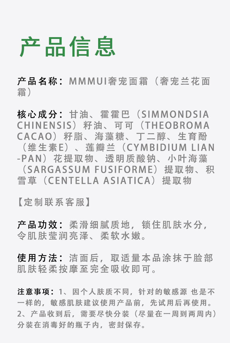 护肤品无法保证百分百不过敏,就算是在昂贵的护肤品化妆品都有人过敏,亲们 再购买前应充分了解自己的肤质对配方或者某种产品成分是否过敏,拿到产品后可以 现在你皮肤较薄的地方做测试,像耳后手腕内侧,经过24-48小时的观察,任何护肤品 使用方法都不一样,亲可看清使用方法在购买使用,如果曾经有过敏史,请谨慎选择护 肤品!!!