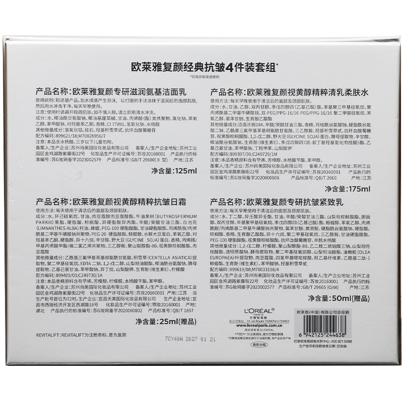 商品名称:欧莱雅复颜水乳套装抗皱紧致冬补水保湿护肤品套装化妆品新年礼物