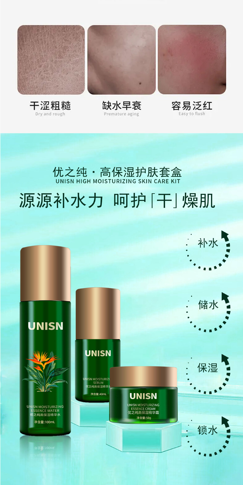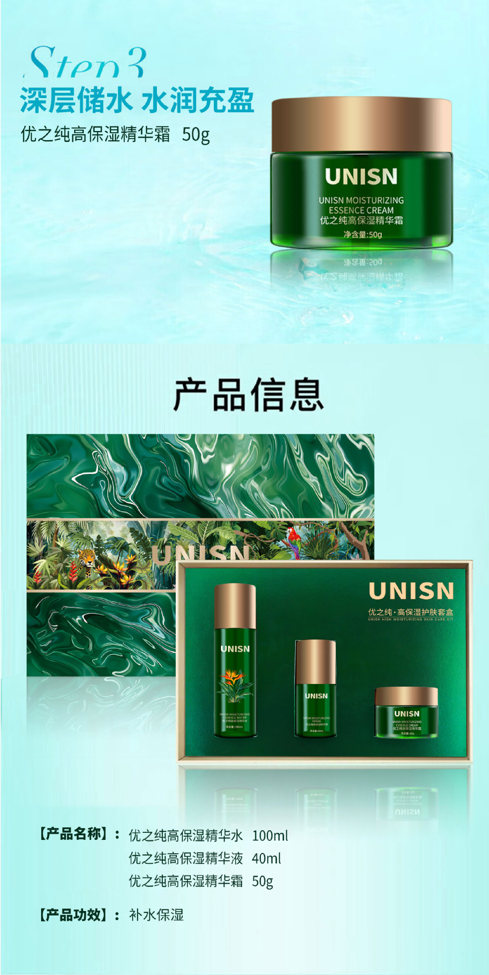 商品名称:unisn/优之纯高保湿护肤套装补水保湿滋润肌肤护肤品三件套礼盒装