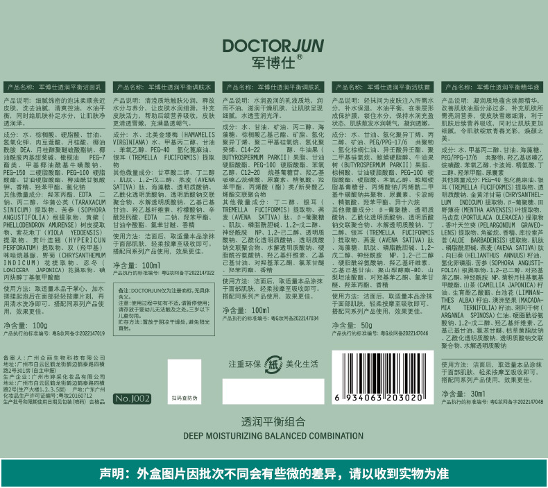商品名称:军博仕透润平衡组合洁面乳水乳霜精华液保湿控油补水护肤品套装