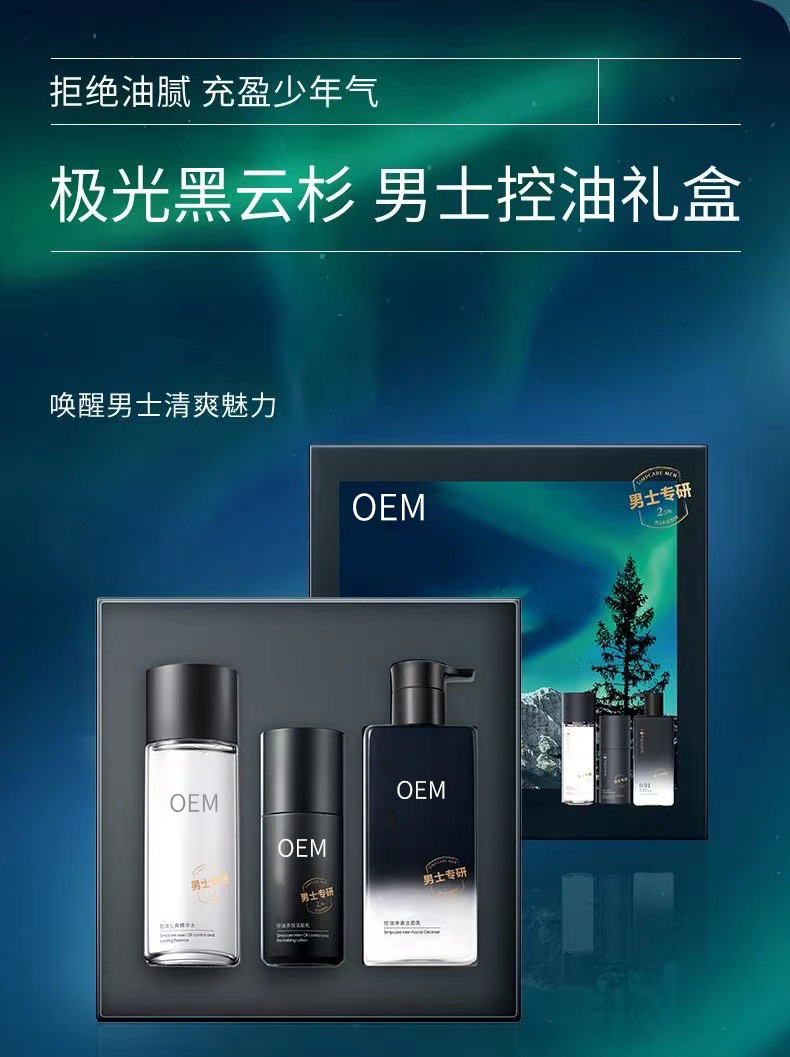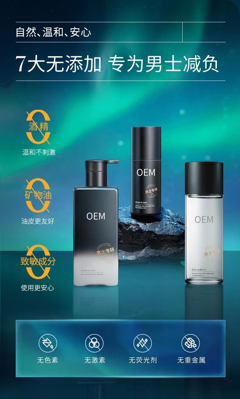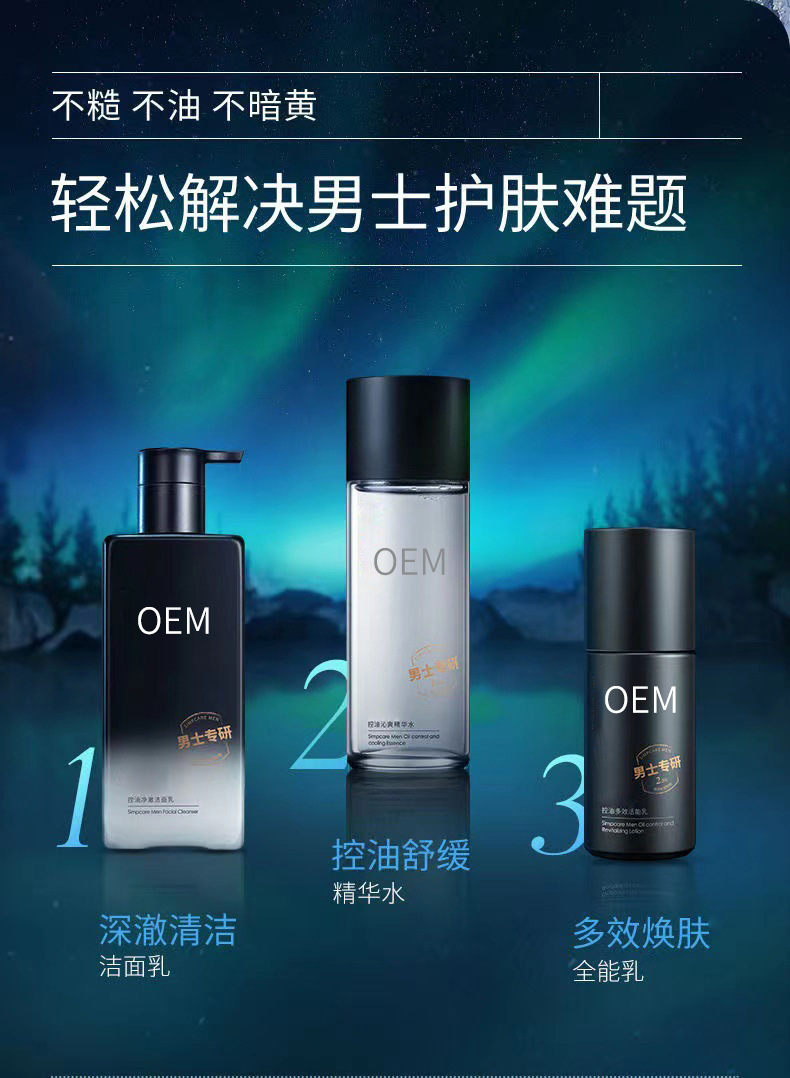 工厂定制男士控油沁爽护肤品套装洗面奶护肤水乳三件套OEM代加工