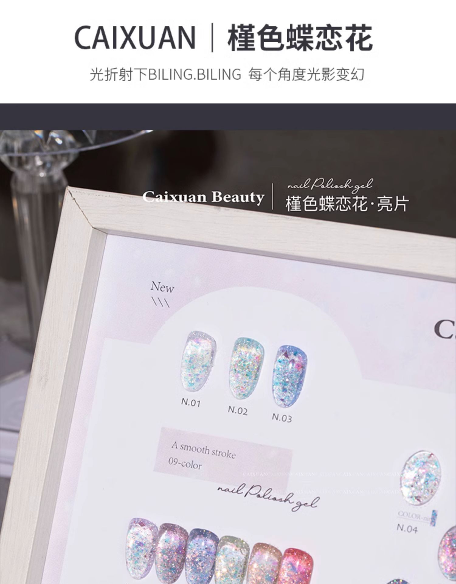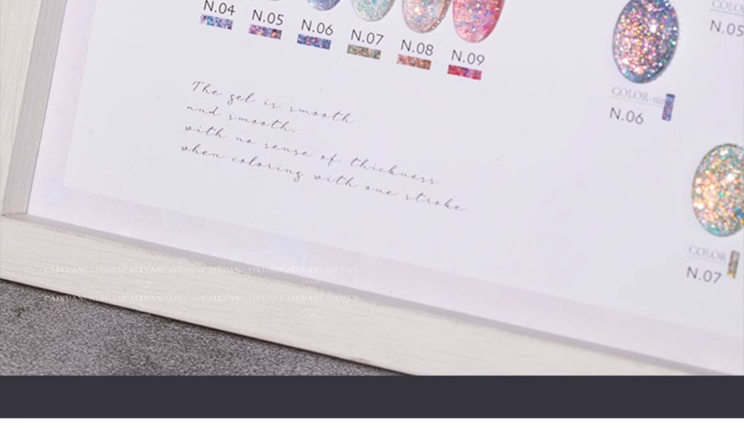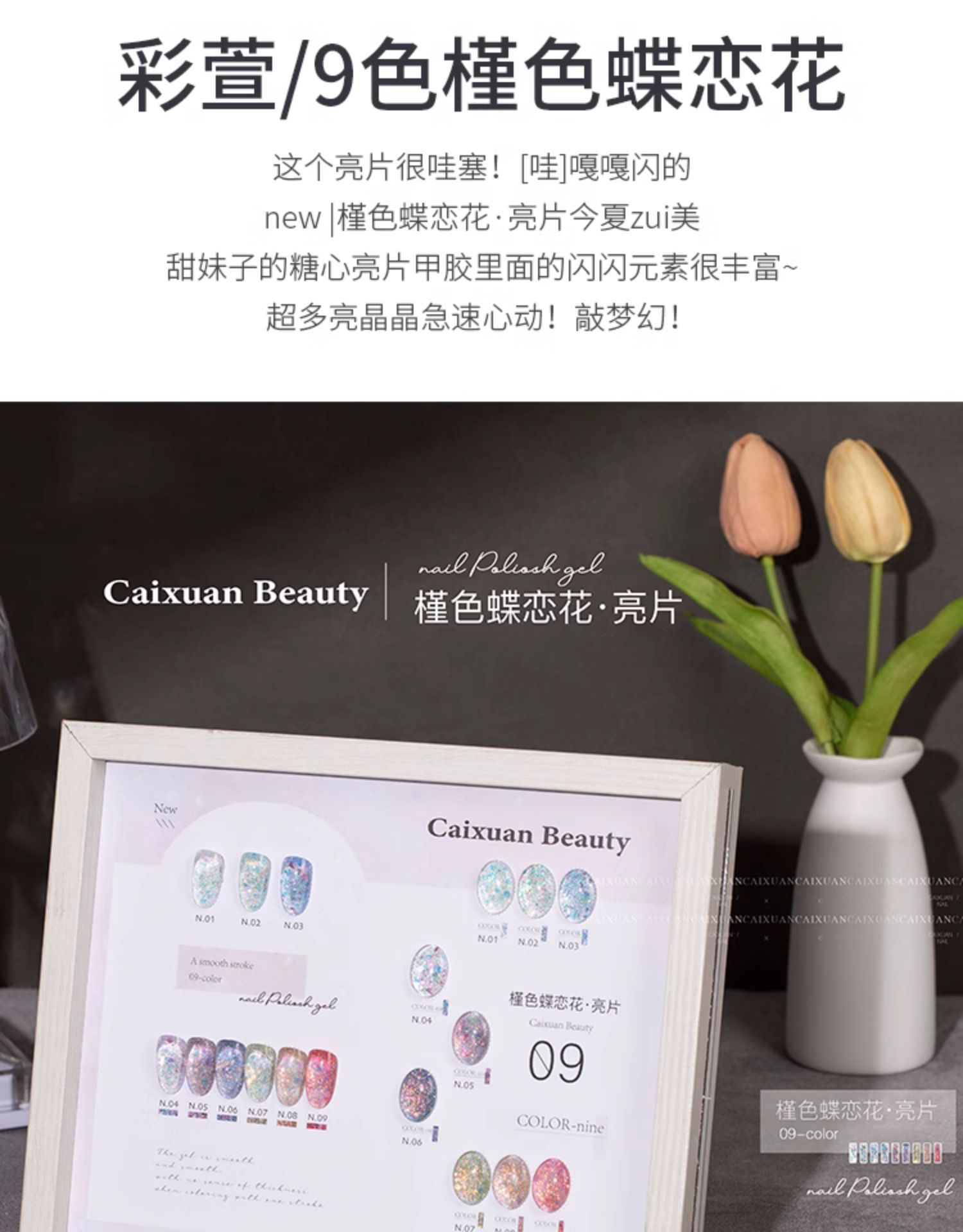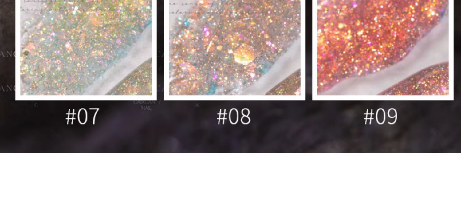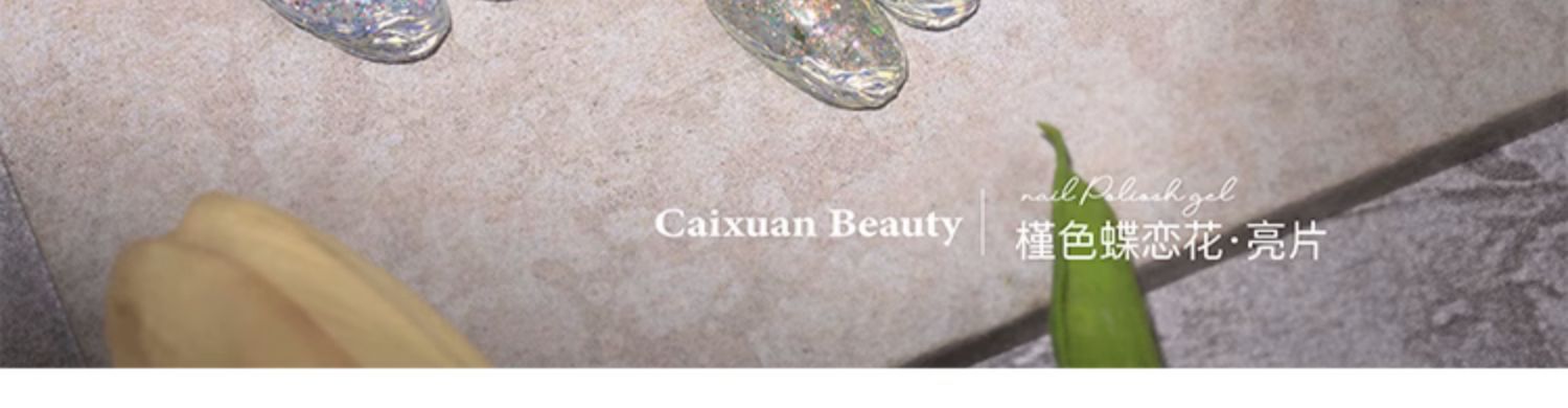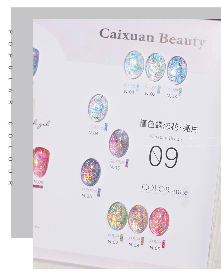 商品名称:指甲油胶彩萱9色槿色蝶恋花大亮片璀璨爆闪粉碎钻胶美甲店专用
