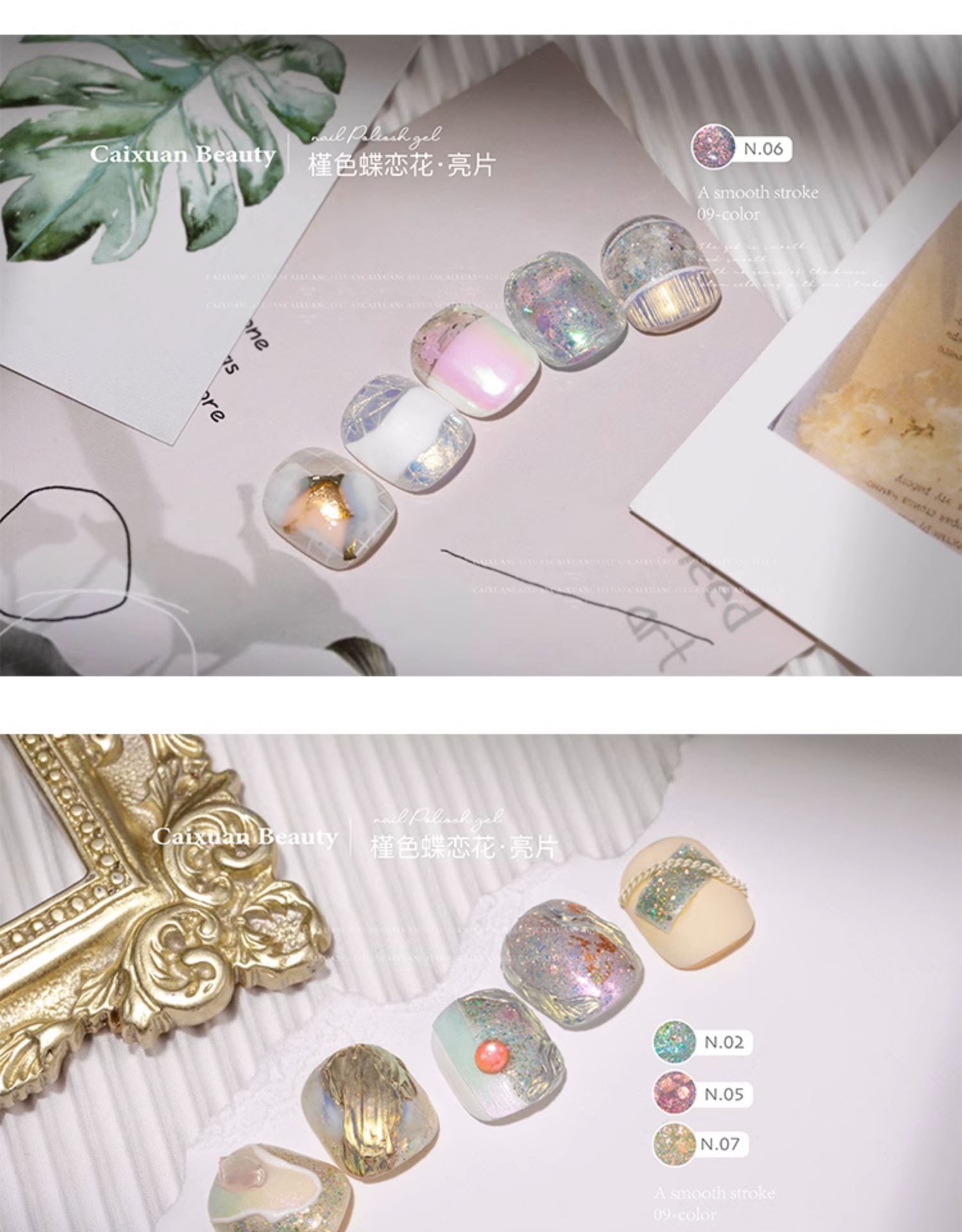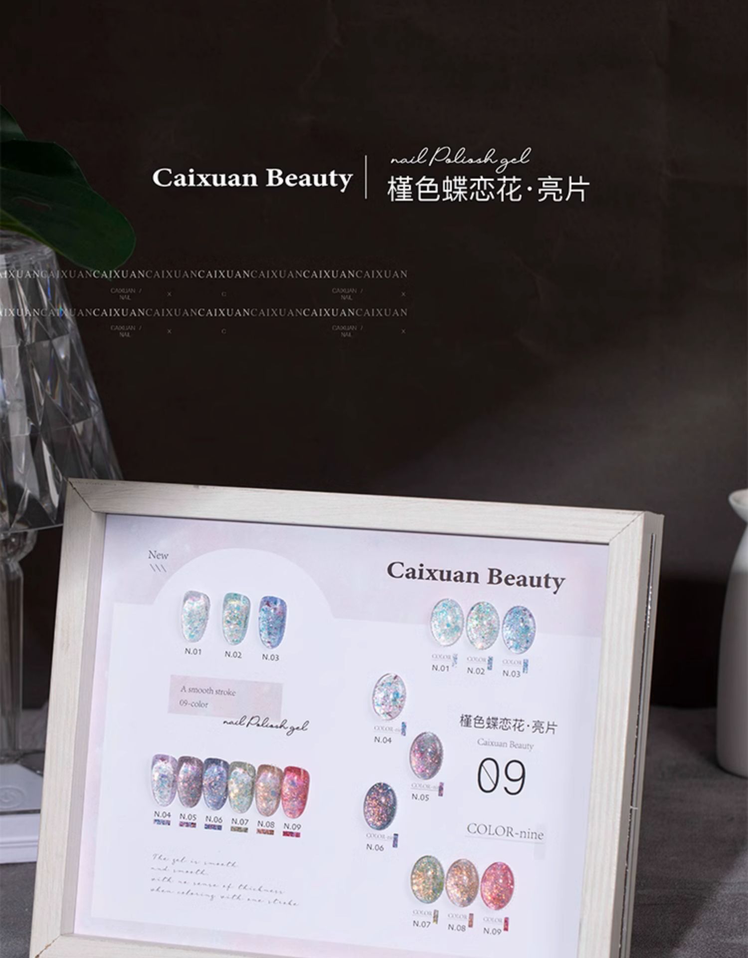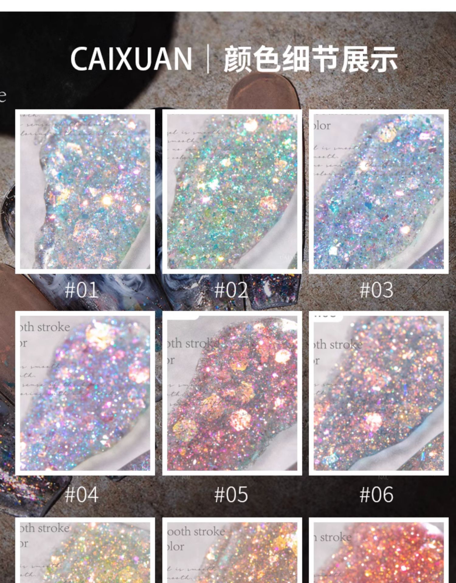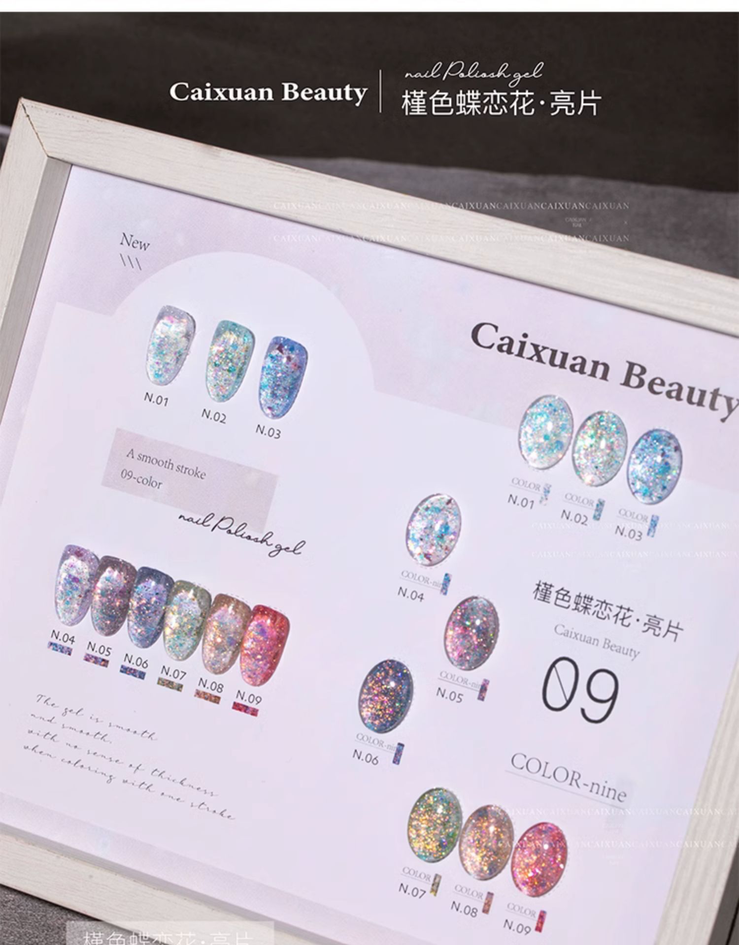 商品名称:指甲油胶彩萱9色槿色蝶恋花大亮片璀璨爆闪粉碎钻胶美甲店专用