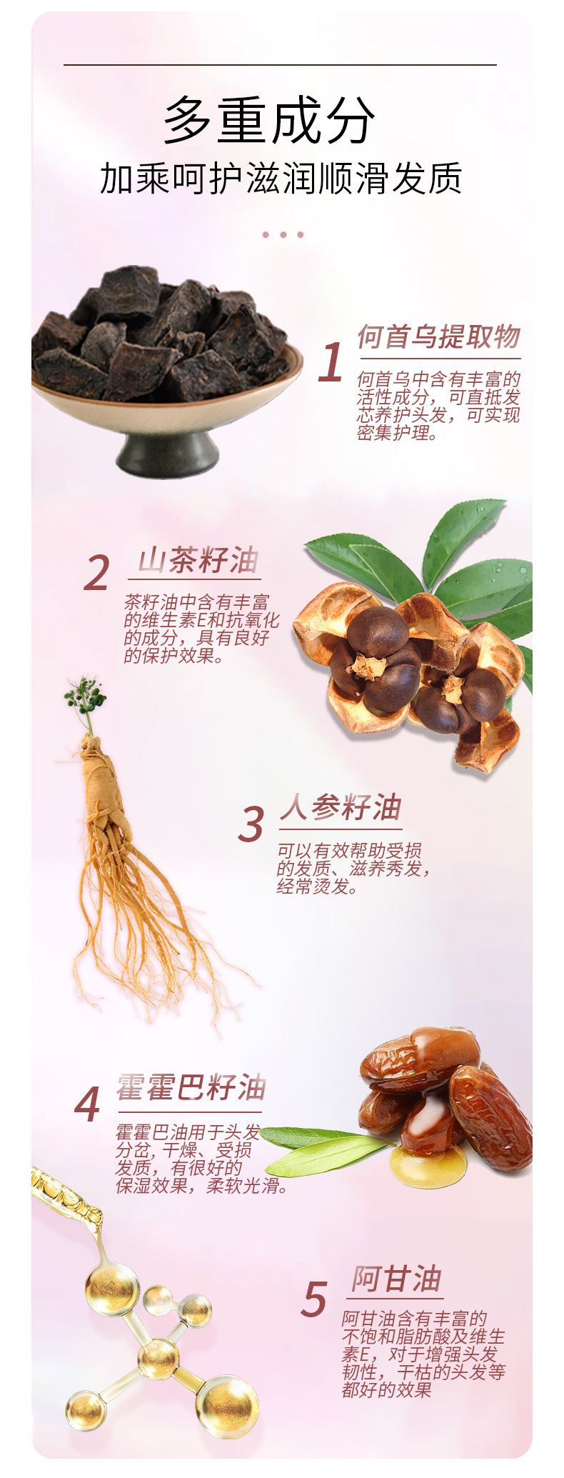 成分原料:阿甘油、霍霍巴籽油、山茶籽油、人参籽油、何首乌提取物、玫瑰花油