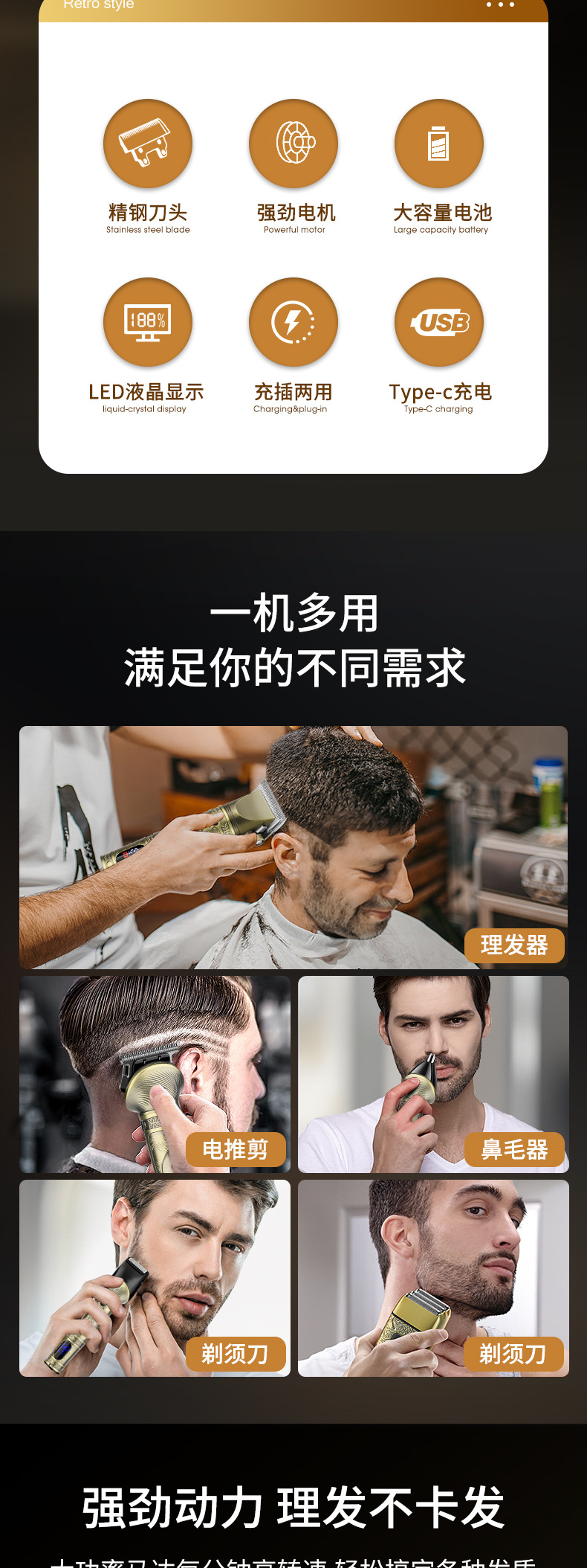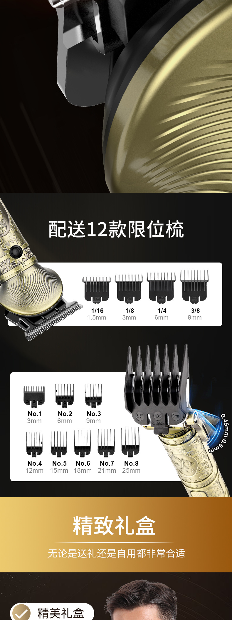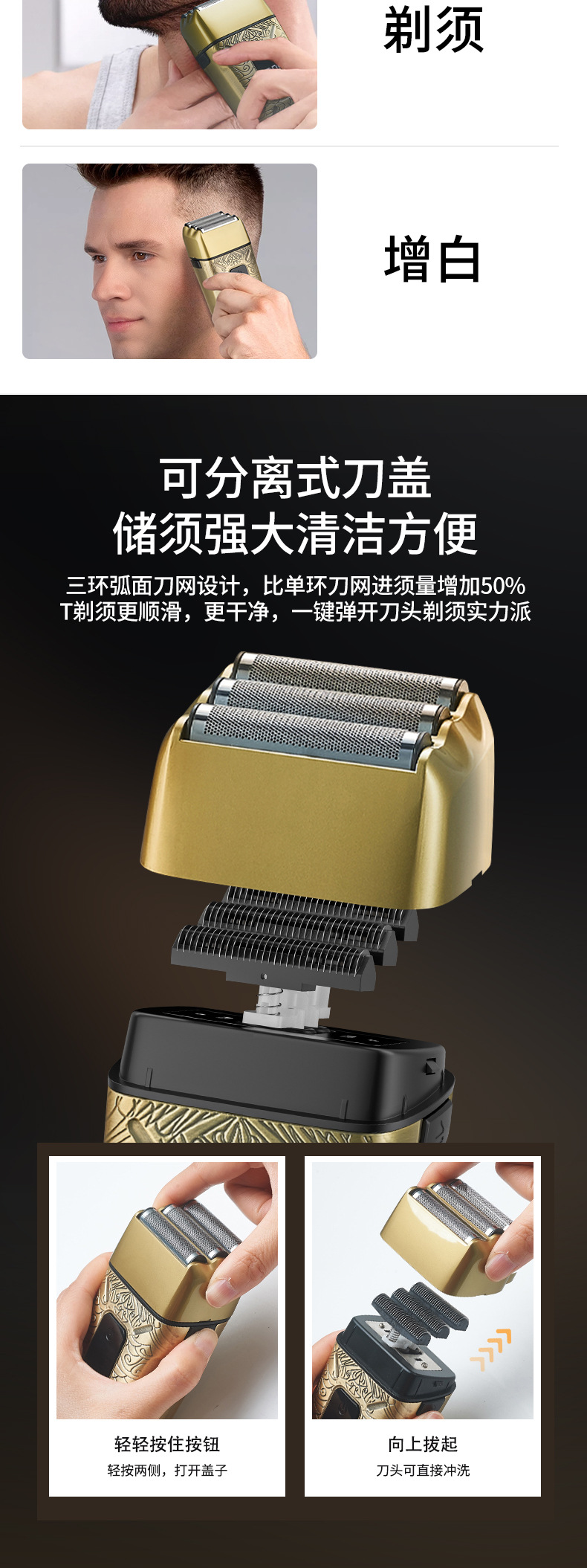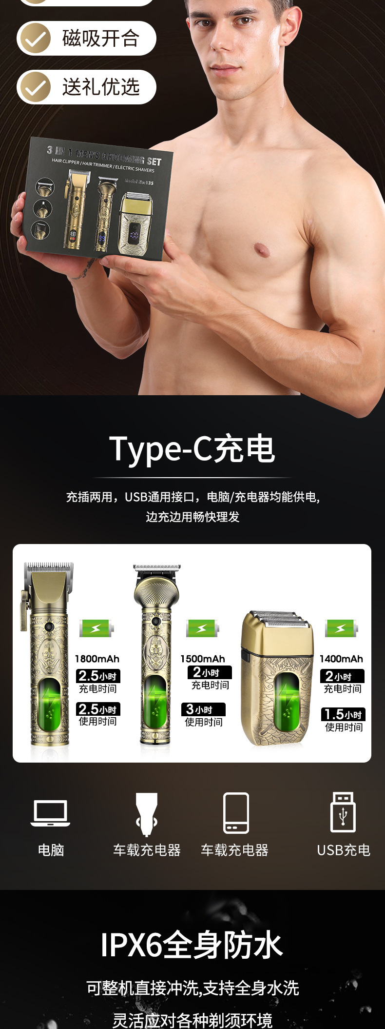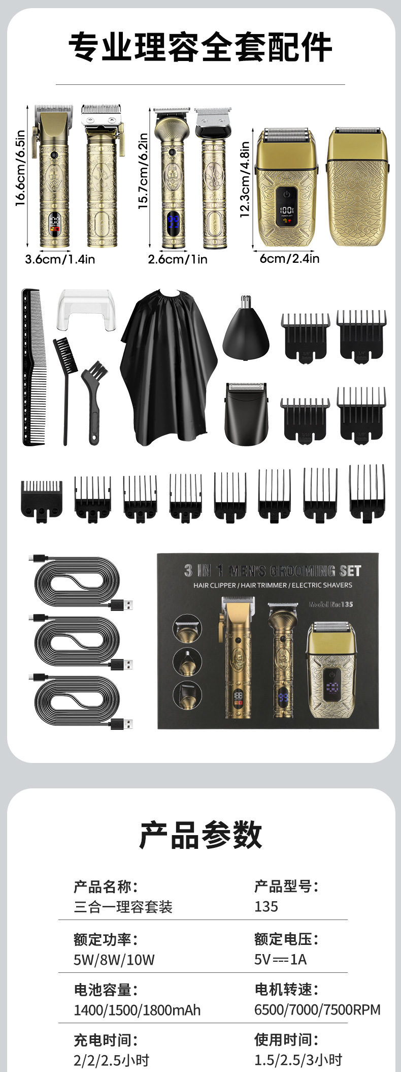 包含配件:大小子母机器+剃须刀+可更换鼻毛器刀头+可更换剃须刀头+USB充电线*3+大机器限位梳*8+小机器限位梳*4+清洁刷*1+美发梳*1+黑色围布*1。