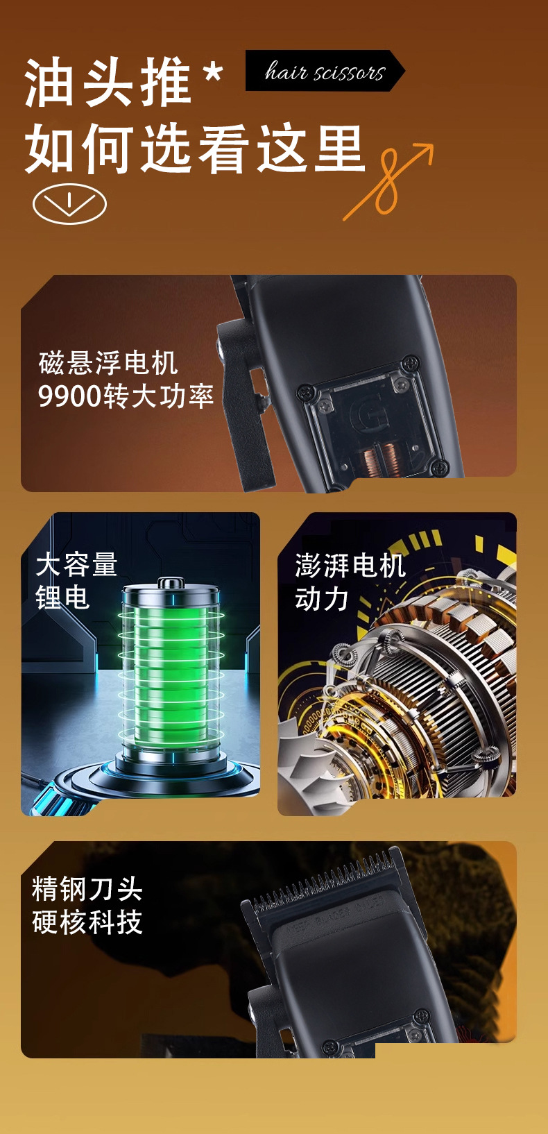 无刷雕刻剪理发器磁悬浮电机DLC涂层刀片理发用品无绳液晶电推剪