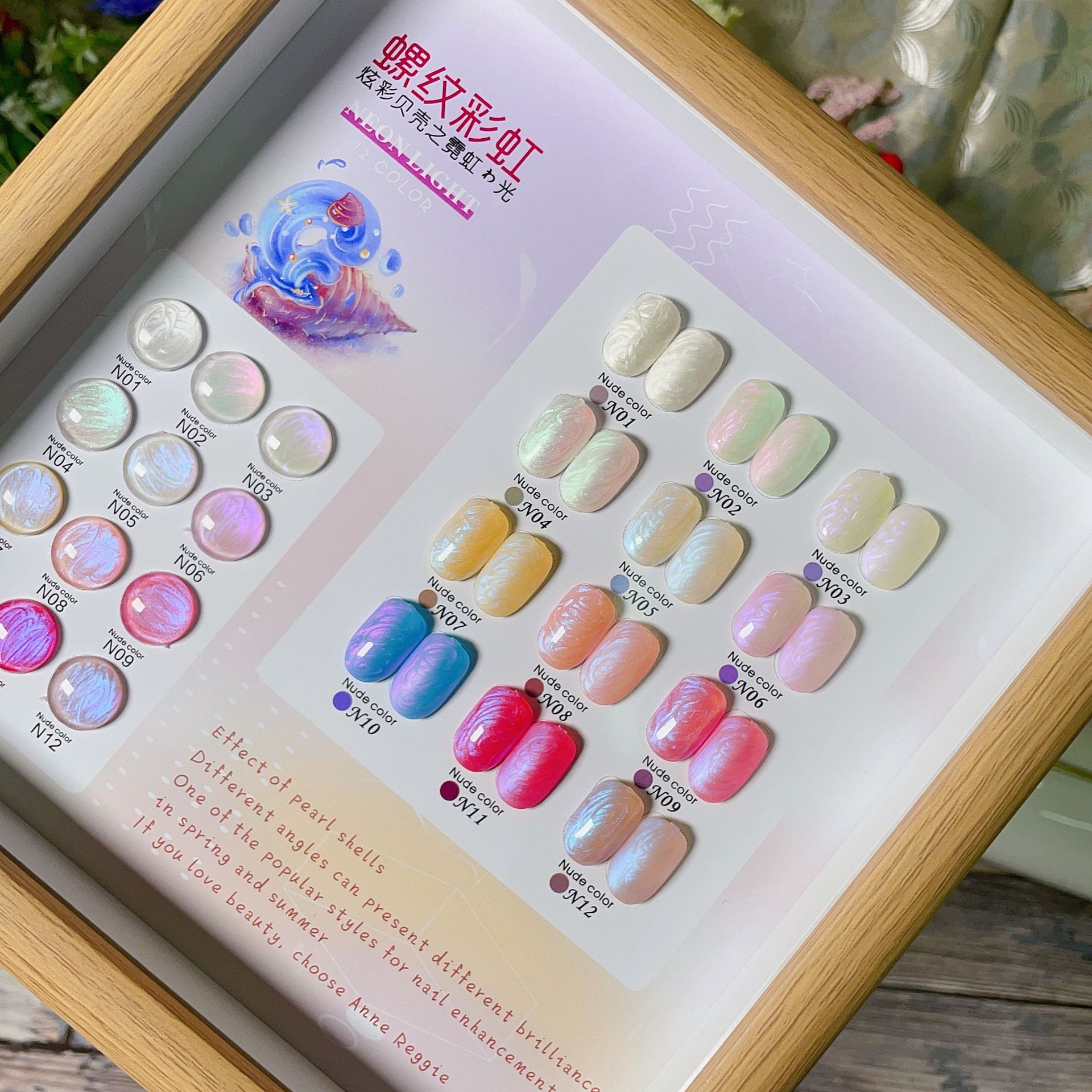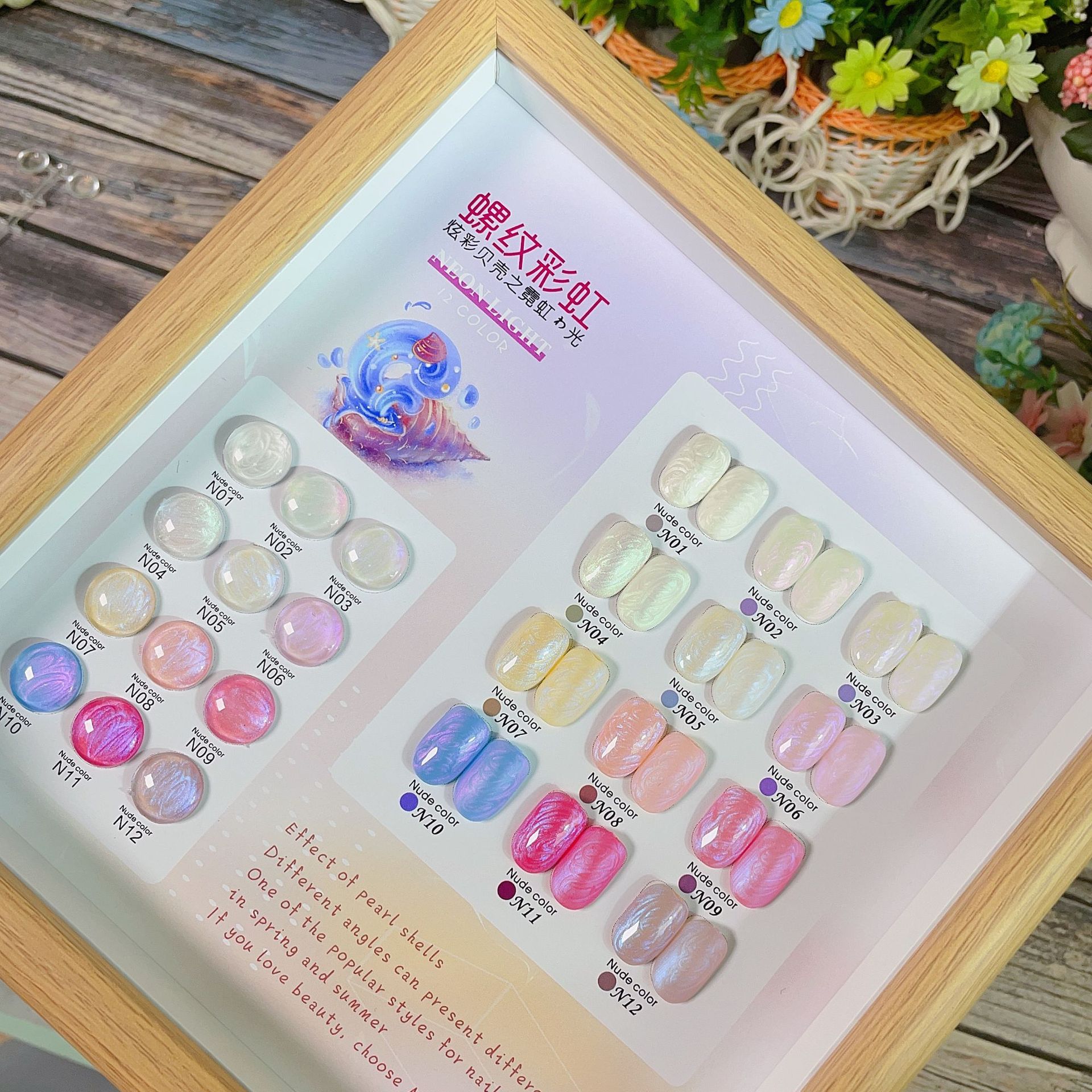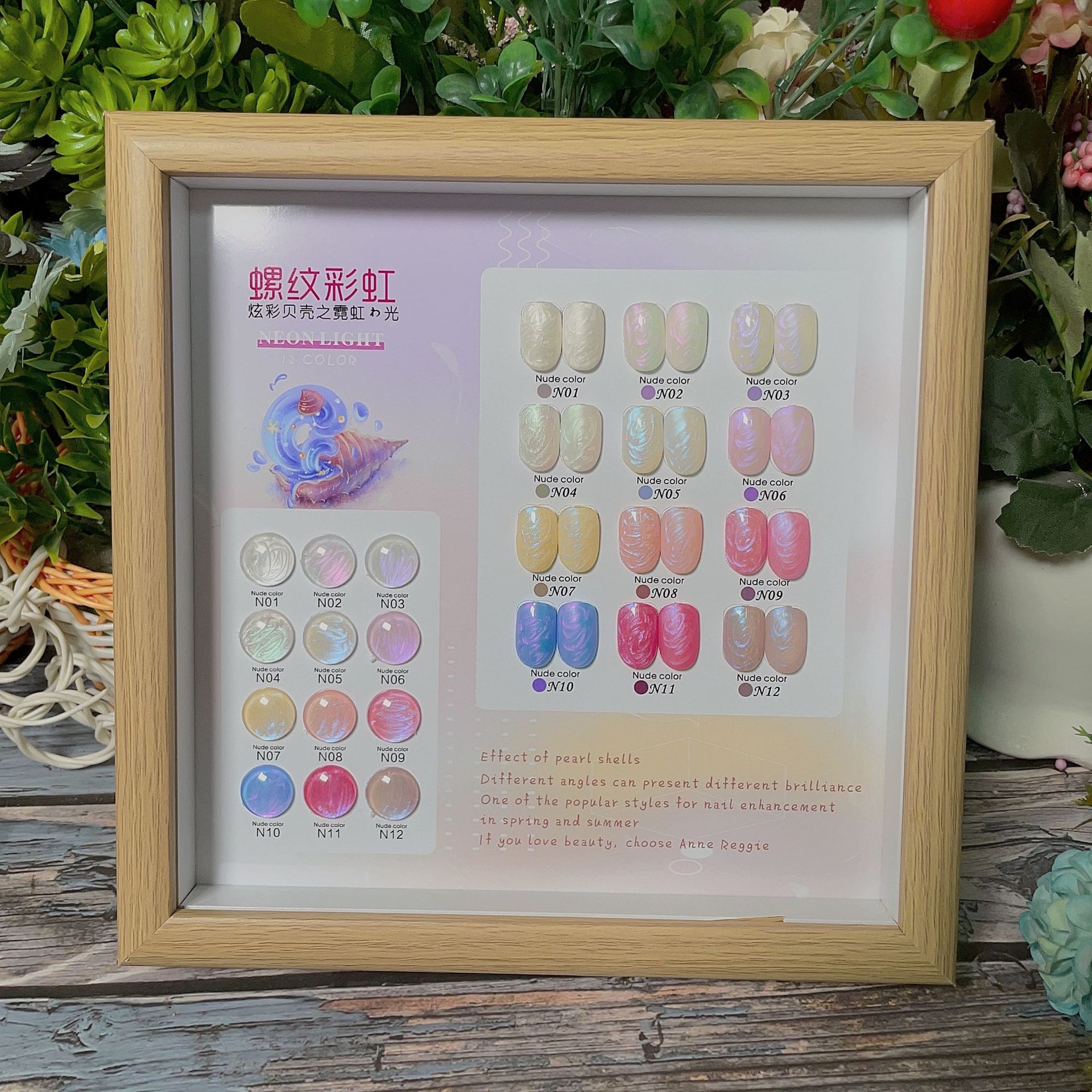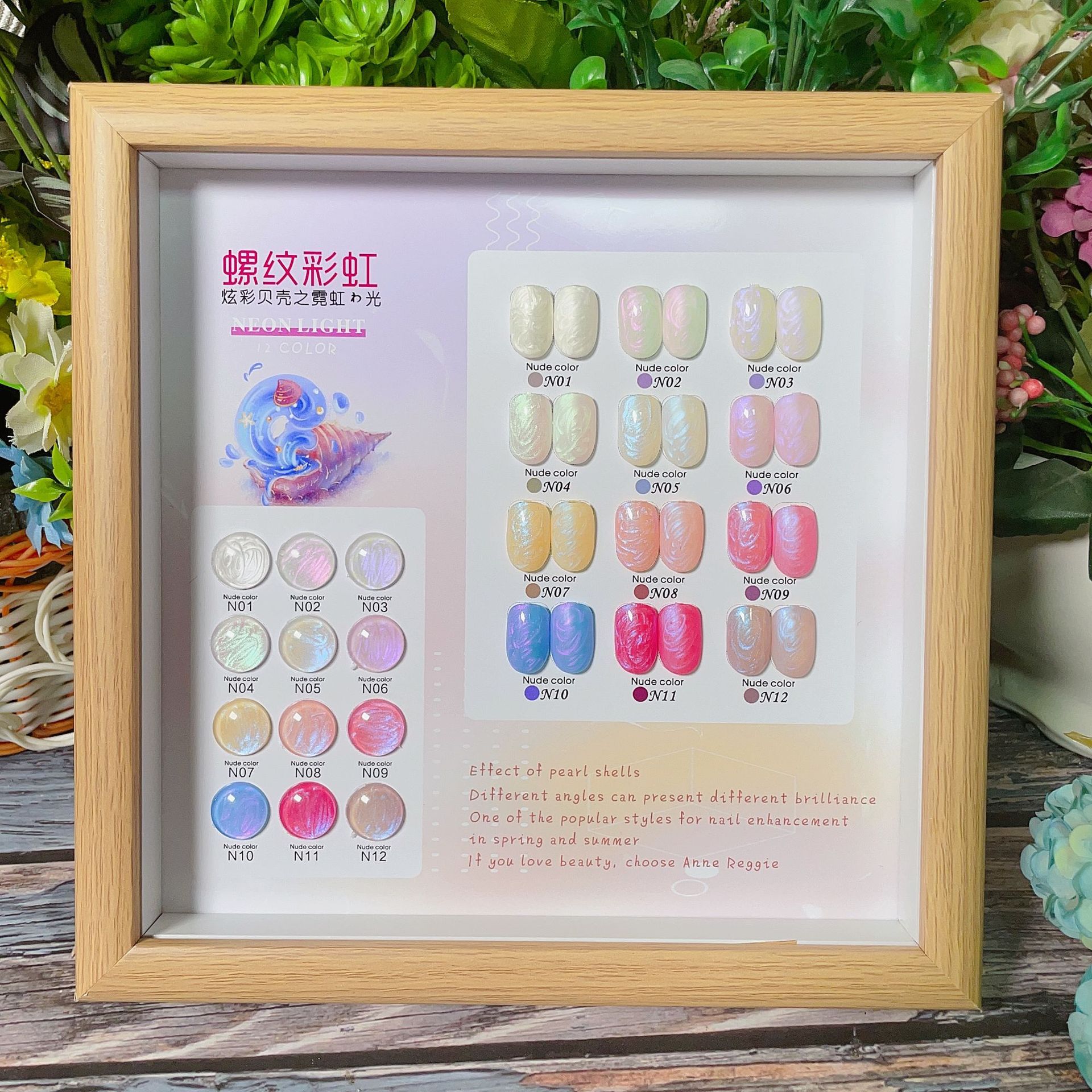 商品名称:12色螺纹彩虹(刷好色板)霓虹独角兽偏光珠光色美甲甲油胶